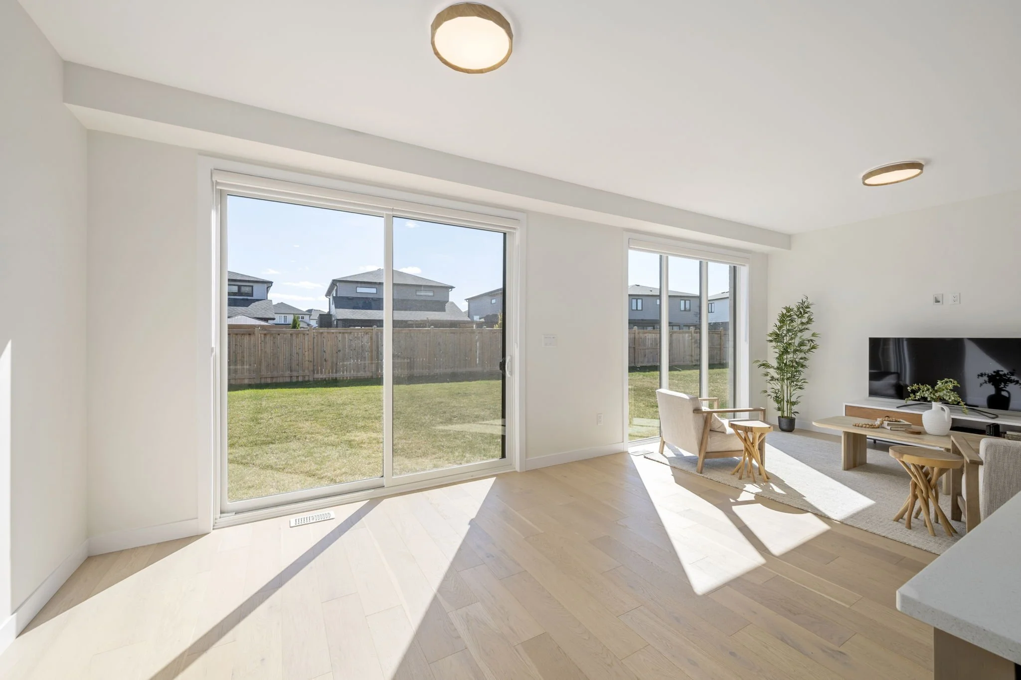 Bright and airy open-concept living and dining areas showcase impressive 8 ft × 8 ft windows and 8 ft × 8 ft patio doors, creating a seamless indoor–outdoor connection to the premium pie-shaped yard.
